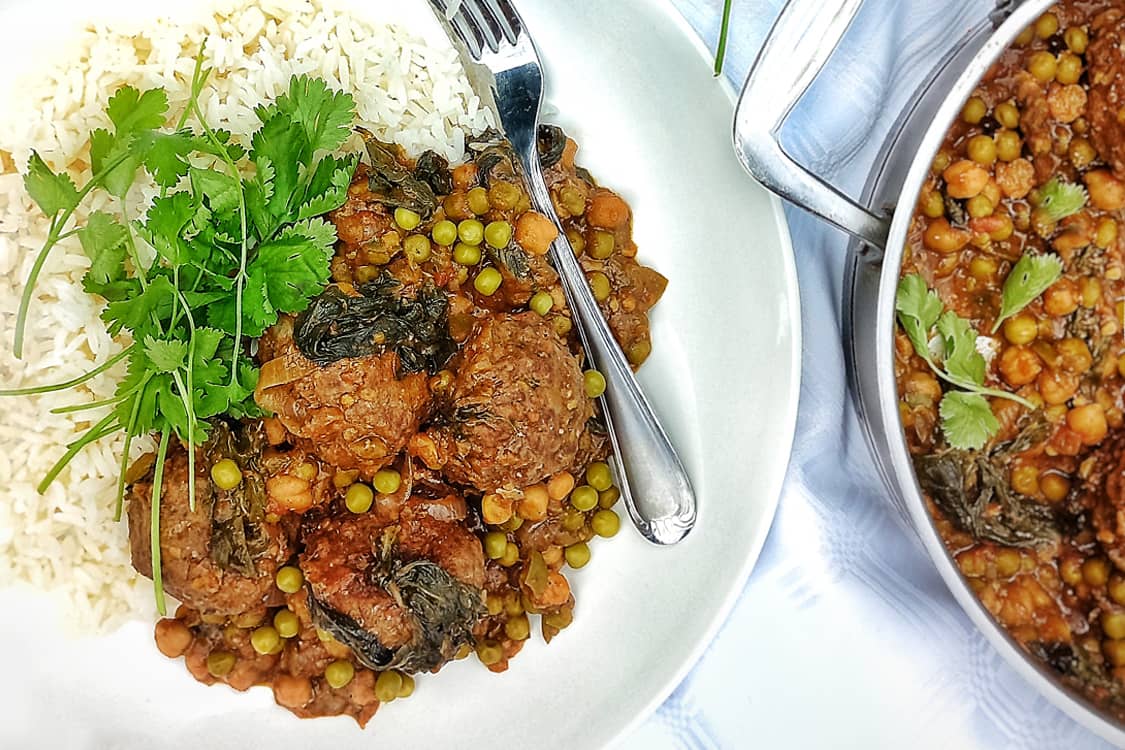 Add the chickpeas, peas and stock, and season with salt then transferthe meatballs back into the pan. Cover and reduce the heat to medium-low and simmer for 15 minutes with the lid on.